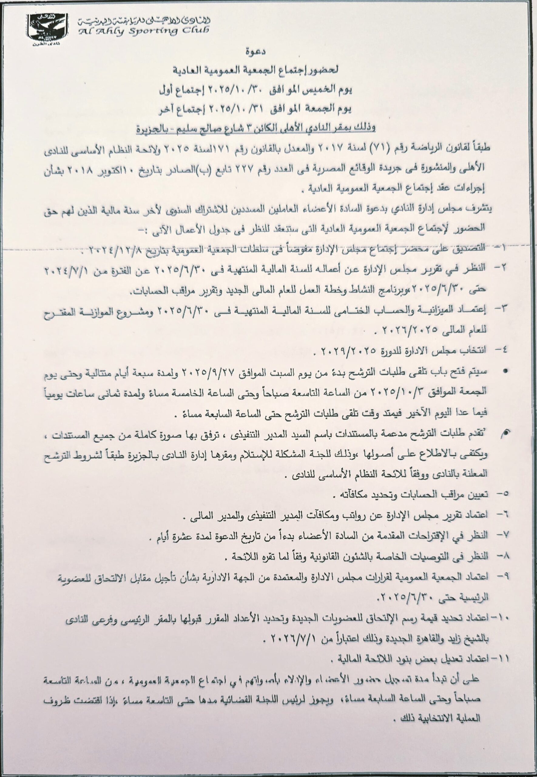 حدد النادي الأهلي عبر موقعه الرسمي بنود جدول الأعمال التي تشمل: