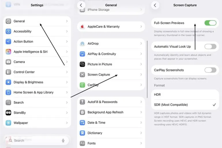لقطة الشاشة | معاينة تلقائية | حفظ مباشر | الإعدادات → لقطة الشاشة |